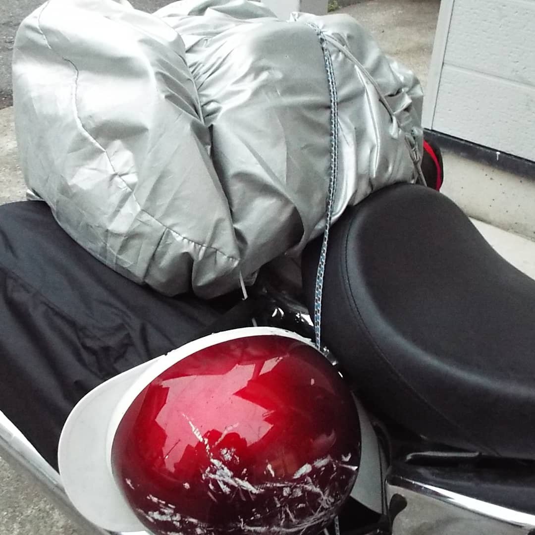 バイクの後ろのシートを外して背中部分にバックの外側のポケット入れて付けてるので