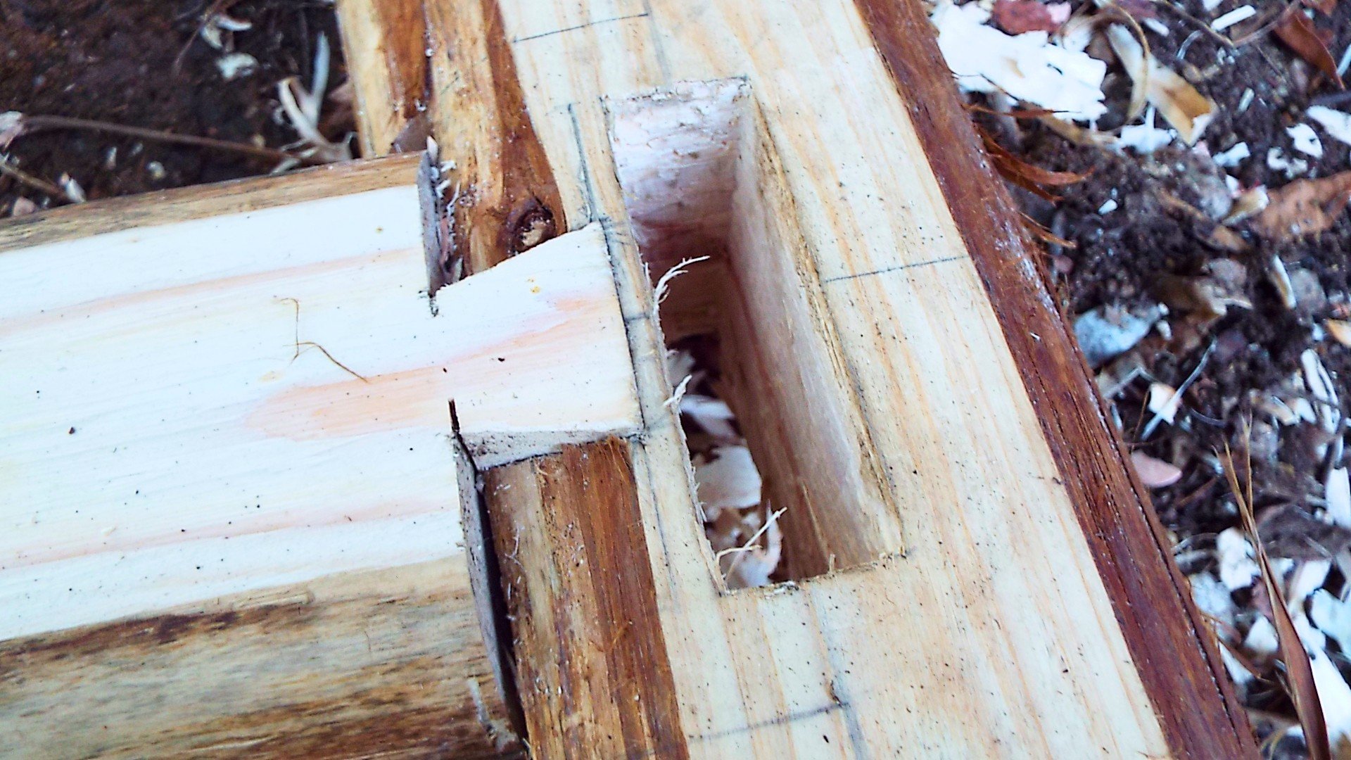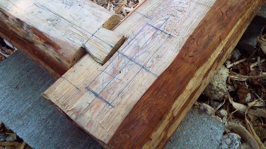 今日は ほぞ穴(柱差し込む穴)掘る作業で