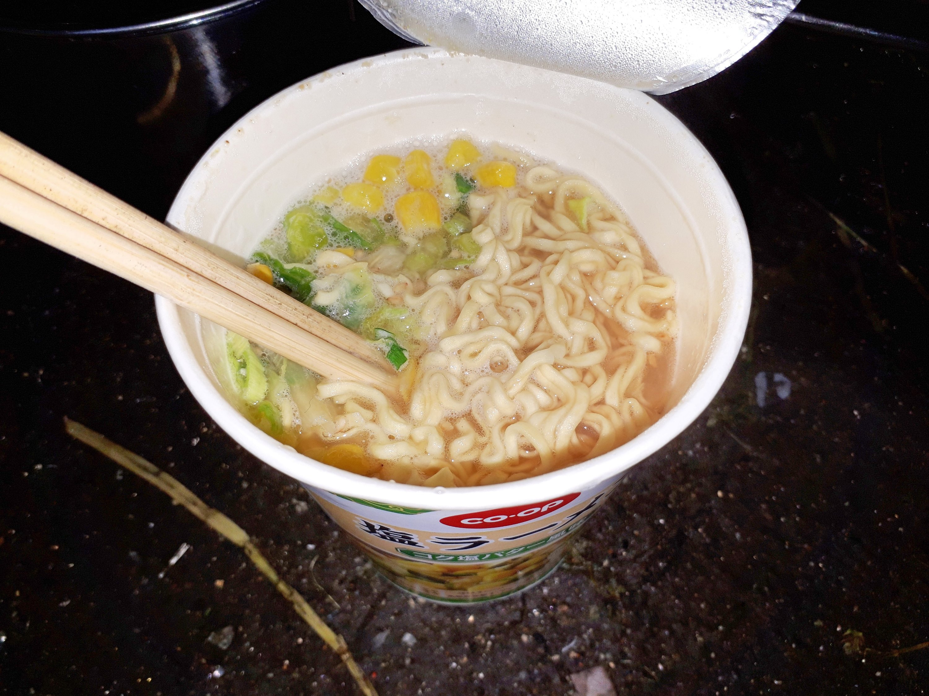 バーナーでお湯沸かして、家から1個だけ持ってきたカップラーメン食べて体を暖めた。+゚☆゚+。